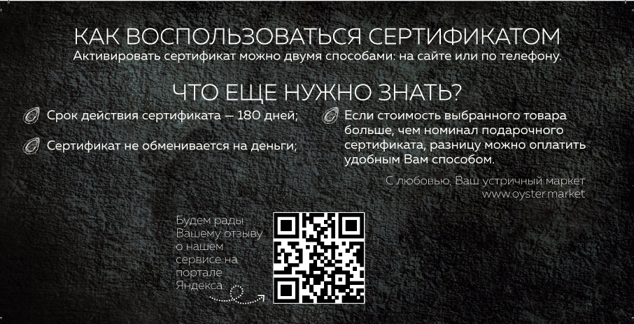 Подарочный сертификат на морепродукты, устрицы — идеальный подарок по любому поводу. Если Вы все ещё думаете, чем порадовать близких, друзей или коллег — подарите им возможность самостоятельного выбора